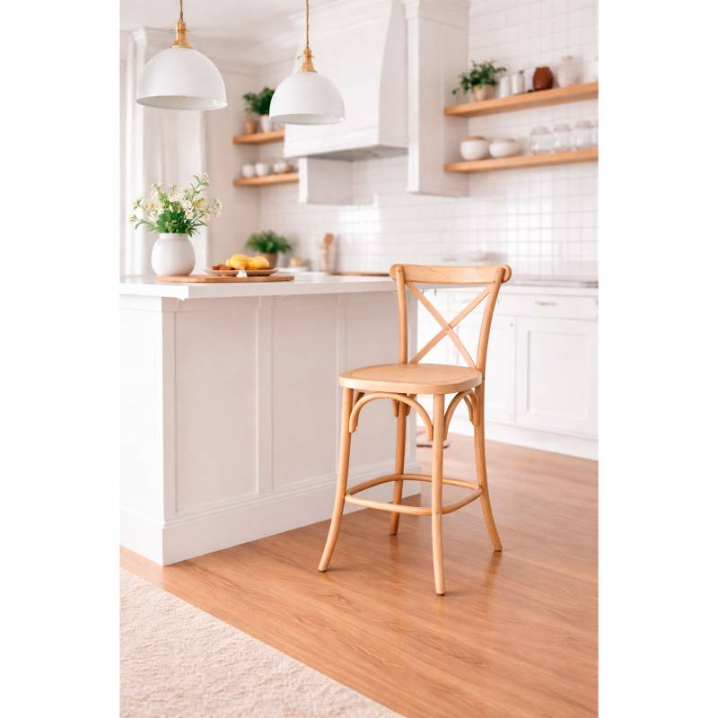 Destaca por su diseño moderno y minimalista, con estructura de madera en acabado natural que aporta calidez y elegancia. Su asiento cómodo y resistente la hace perfecta para comedores, cocinas o espacios de estilo contemporáneo, combinando funcionalidad y estética en un solo pieza.