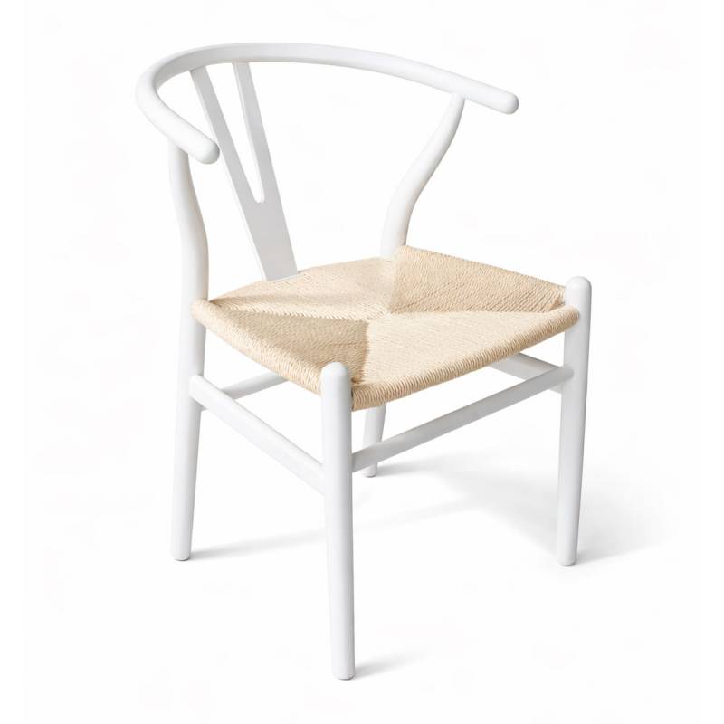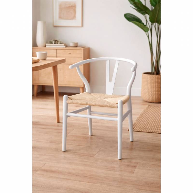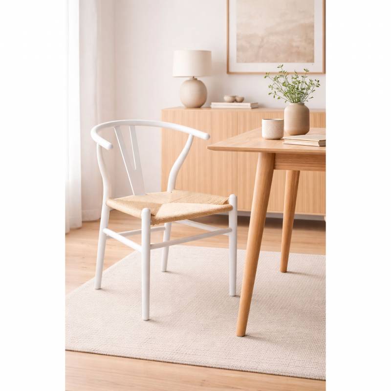 Combina diseño icónico y funcionalidad, aportando calidez y elegancia a cualquier ambiente. Fabricada en madera con acabado blanco y asiento de cuerda trenzada, ofrece confort, resistencia y un estilo atemporal ideal para comedores, living o espacios de diseño contemporáneo y nórdico.