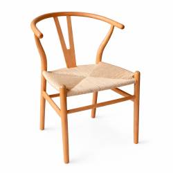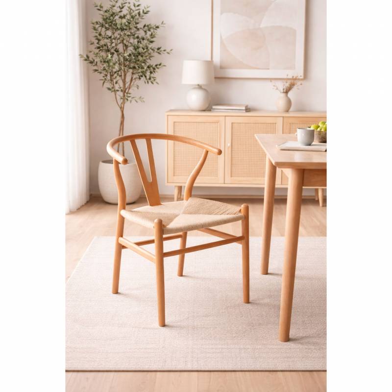 Combina diseño icónico y funcionalidad, aportando calidez y elegancia a cualquier ambiente. Fabricada en madera con acabado natural y asiento de cuerda trenzada, ofrece confort, resistencia y un estilo atemporal ideal para comedores, living o espacios de diseño contemporáneo y nórdico.