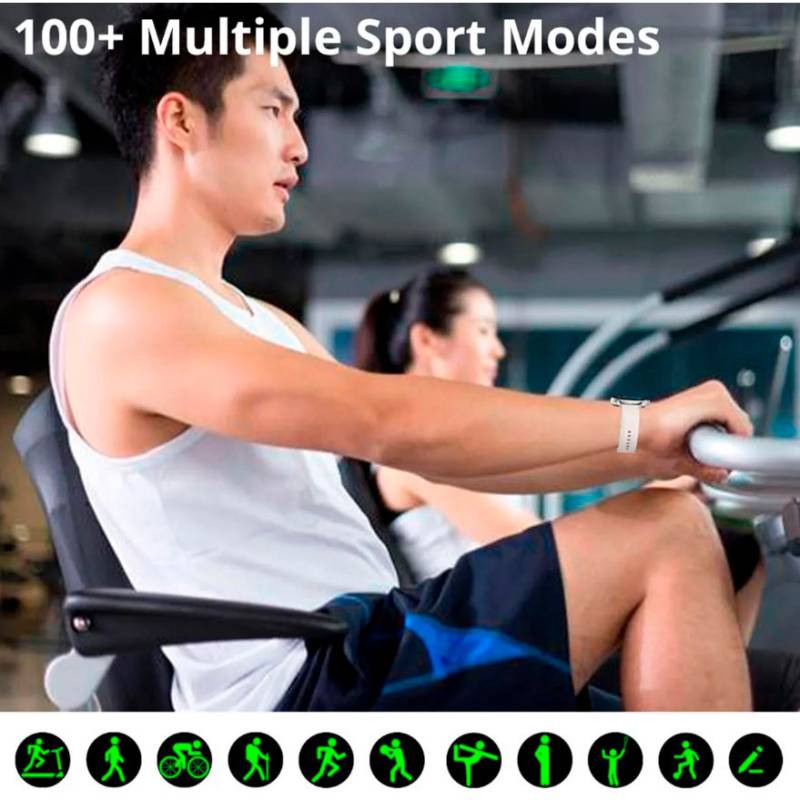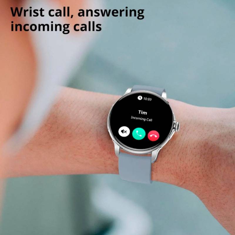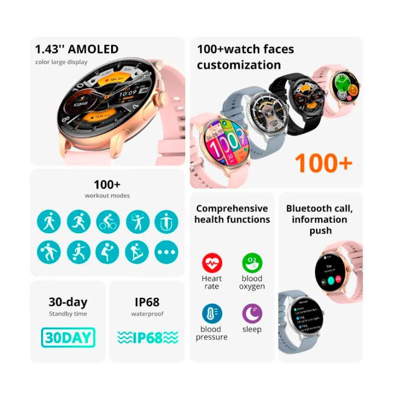 Atiende y realiza llamadas desde el reloj , Asistente de Voz, Funciones de Salud, Funciones Deportivas, Batería de alta duración, fondos de pantalla intercambiables gratis. Malla de Silicona.