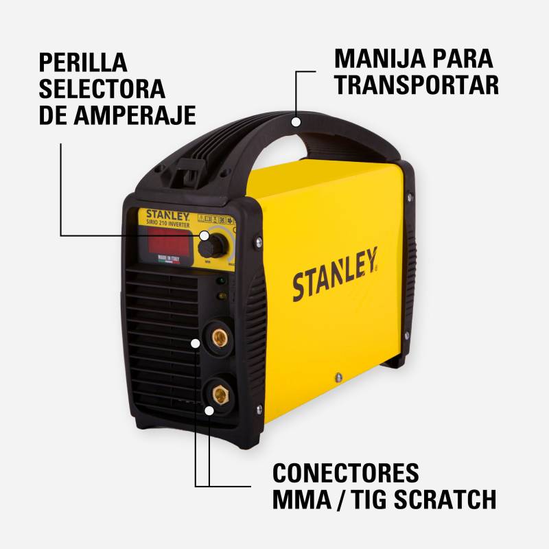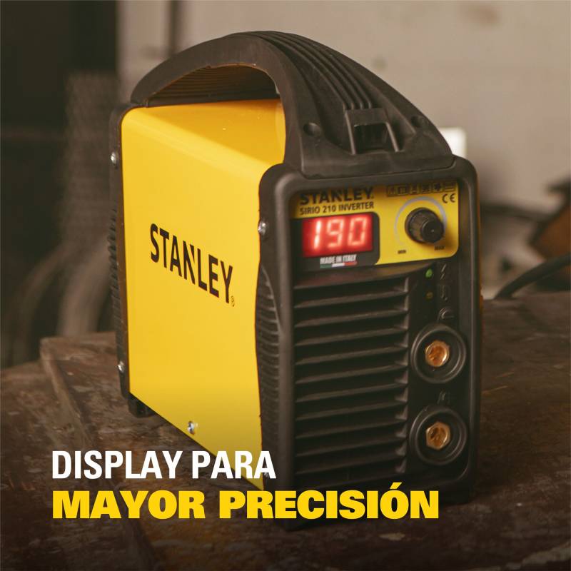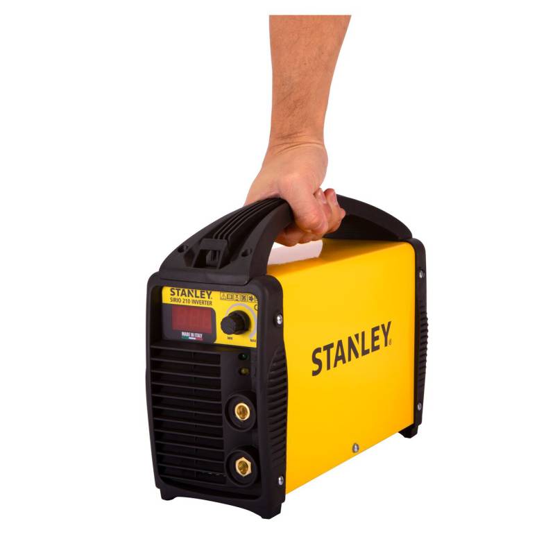 Soldadora Italiana Stanley 190A Con Maletín Sirio 210 * Rango de corriente de soldadura (A) 30 - 160A (190A max). * Rango de electrodos (mm) 1,6 - 4 (5)mm. * Potencia absorbida (kVA) 6,7. * Consumo de corriente nominal (A) 16,1. * Interruptor automático recomendado (A) 25. * Voltaje en vacío (V) 60. * Voltaje de red (V / Hz) 230V / 50-60Hz. * Ciclo de trabajo Normal (A / %) 190A / 30%. * Ciclo de trabajo bajo norma (A / %) 160A / 10%.