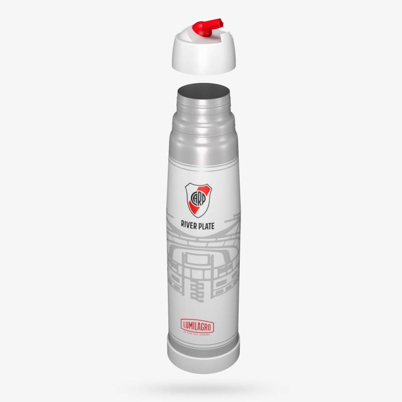 Termo de acero inoxidable impreso con diseño del Club Atlético River Plate y su estadio, posee una capacidad de 1000 cc.