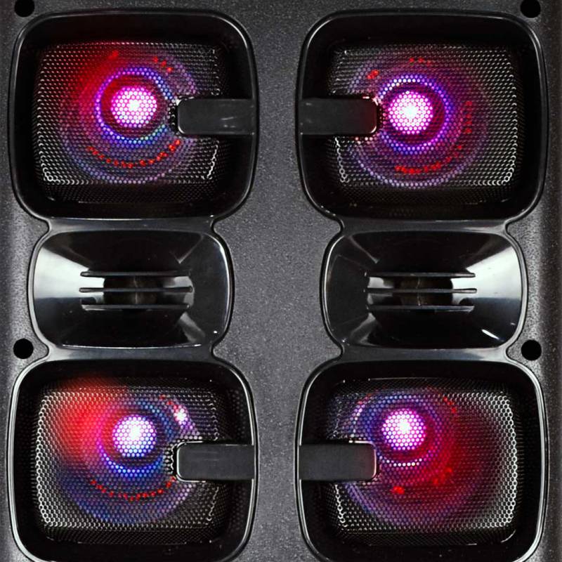 Este equipo no solo ofrece múltiples formas de conexión Bluetooth, USB, micro-SD, entrada auxiliar y radio FM sino que también incluye funciones ideales para karaoke, como entradas para micrófono, ajuste de eco, bajos y agudos, y capacidad de grabación. Su tecnología TWS permite parear dos unidades para lograr un sonido estéreo potente y expansivo.