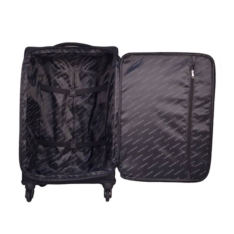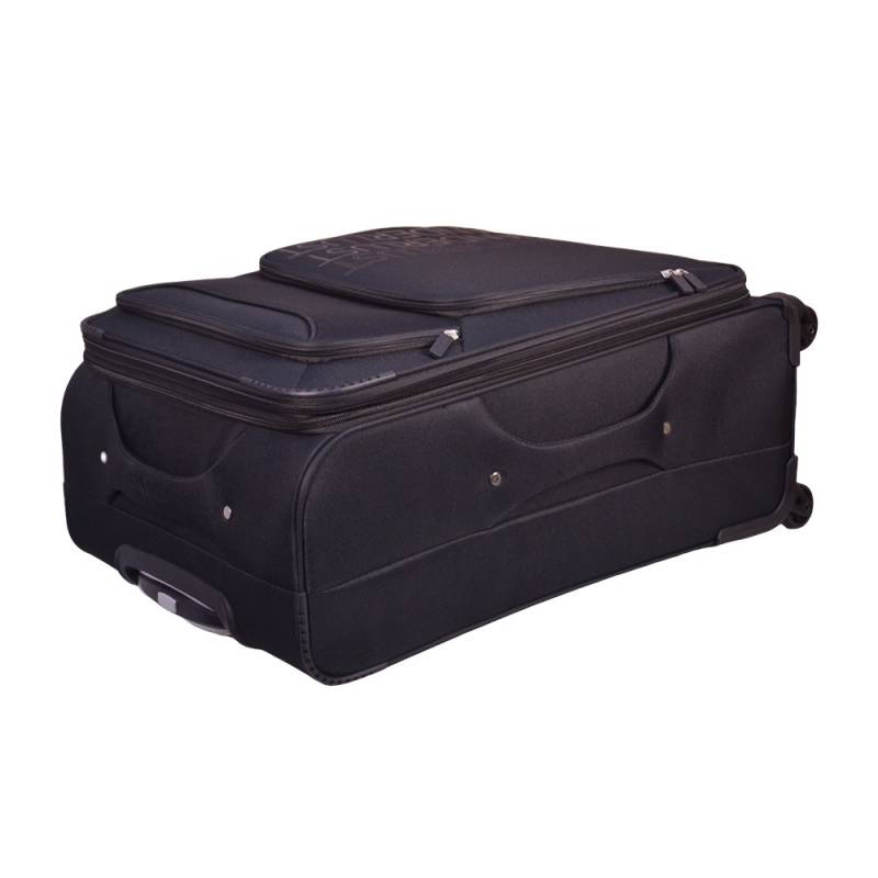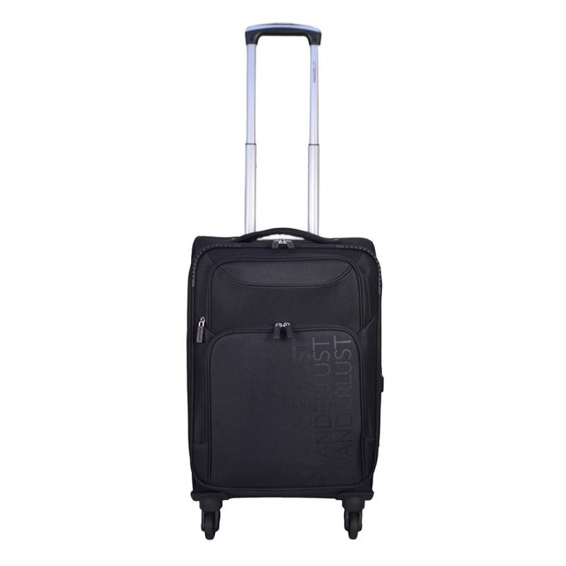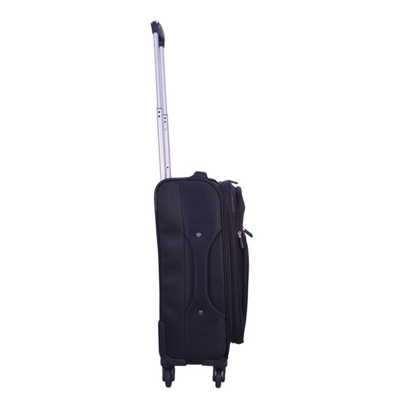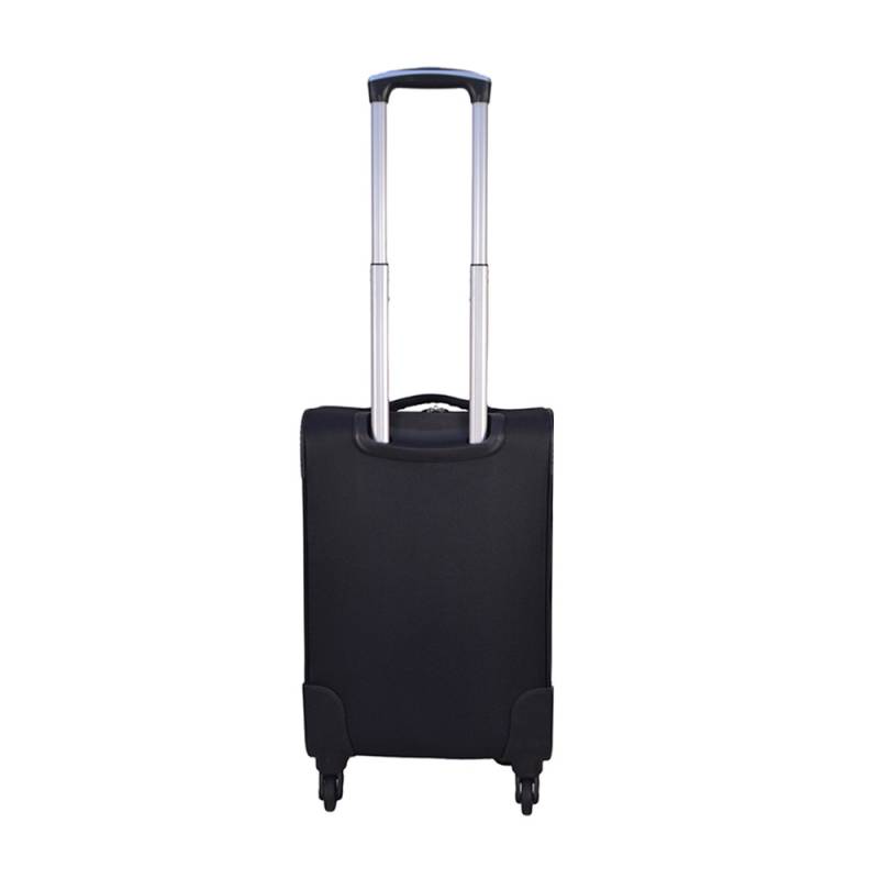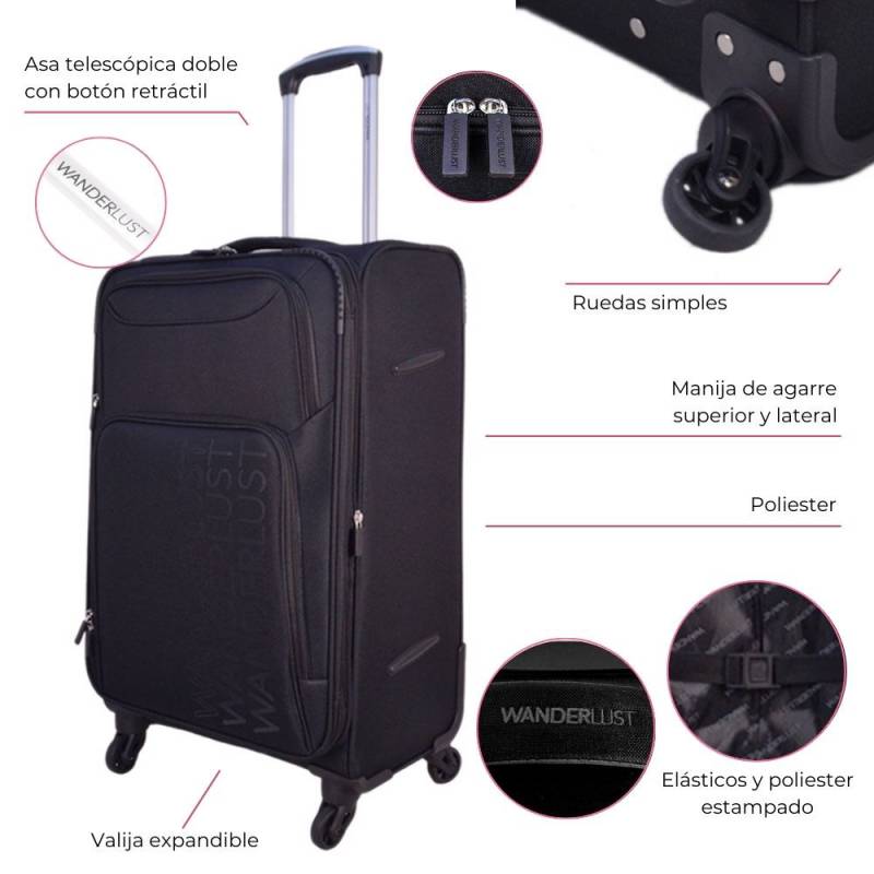 Valija soft semi rígida de 20" color negro. Compartimento principal con cierre con fuelle expansible y dos bolsillos exteriores. Asa telescópica doble con botón retractil. Sistema de 4 ruedas extraibles dobles giratorias de 360°