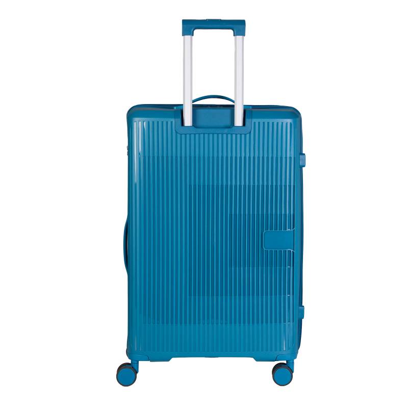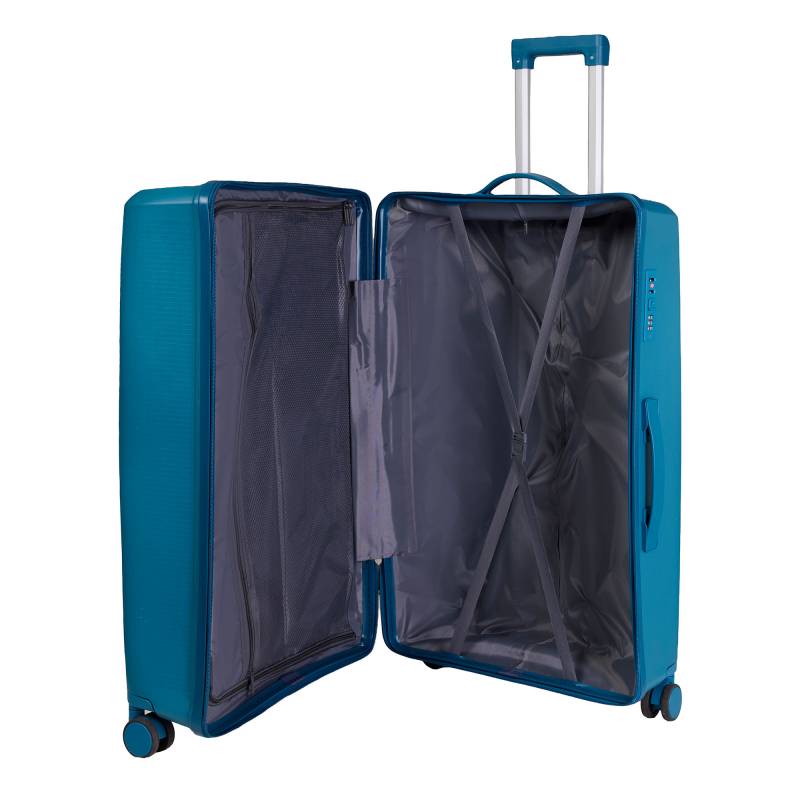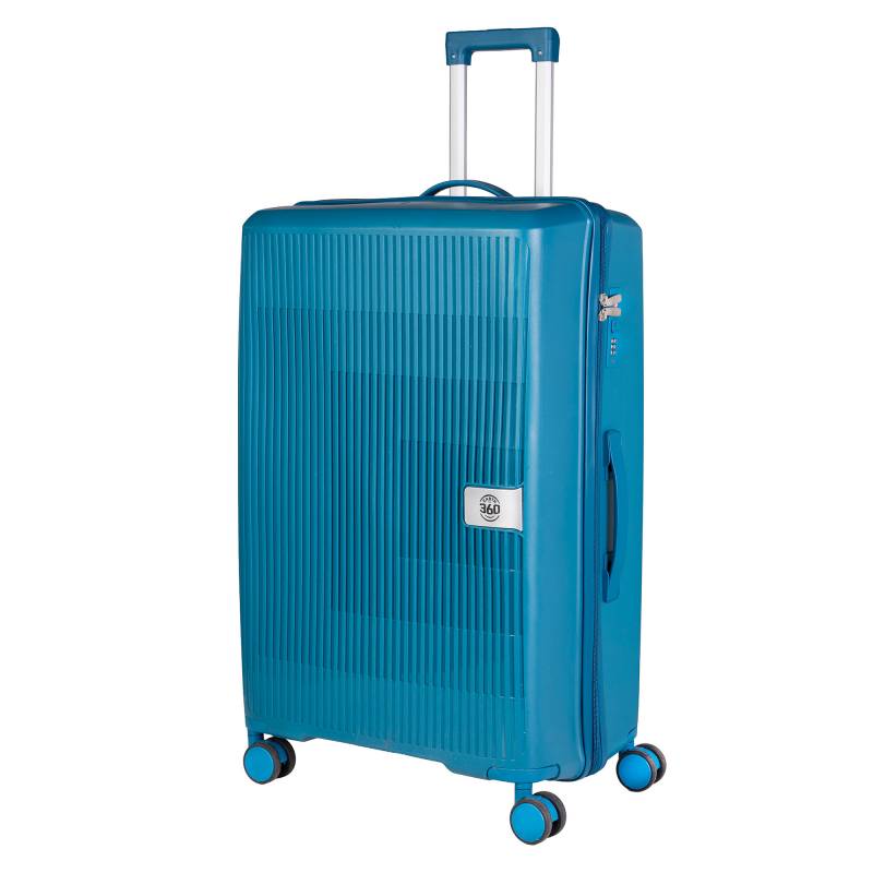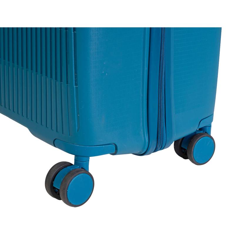 Valija rígida grande en color azul, diseñada para ofrecer resistencia y estilo en cada viaje. Fabricada con materiales duraderos, cuenta con cuatro ruedas giratorias para un desplazamiento suave en todas las direcciones, manija telescópica ajustable y cierre seguro. Su interior amplio permite organizar tus pertenencias de manera práctica, convirtiéndola en la opción ideal para viajes largos.